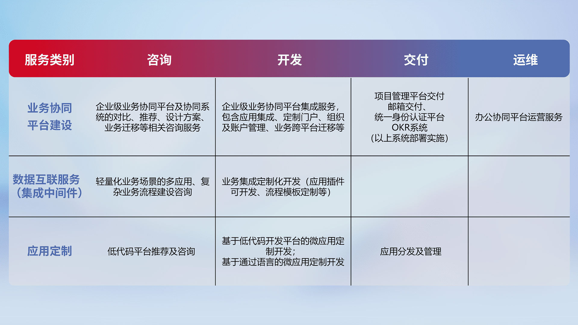 针对钉钉、、企微、、、IDaas等平台级产品提供产品的规划、、、、方案、、、、交付、、、定制化开发等服务,,实现如统一协同办公、、、智能客户服务、、混合会议管理、、、、智能数据查询、、、等业务场景,,,实现数字化转型。。